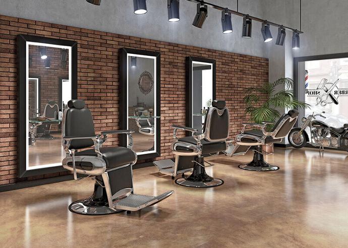 Mobilier pour salon complet barbier qui s'adapte à toutes les décorations barbershop : 3 coiffeuses ROGER B LED et 3 fauteuils barbiers PRINCE.