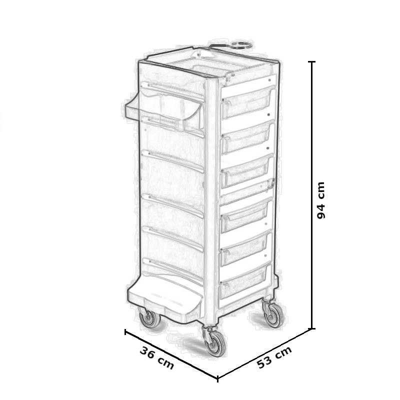 Le chariot de rangement YCON, solide et pratique est un véritable atout pour votre salon de coiffure. Il est très léger, et peut être équipé de roulettes rapides anti-cheveux qui sont spécialement conçues pour ne pas accrochés les cheveux au sol et ainsi faciliter son déplacement. Il est doté de 6 tiroirs de rangement et d'une tablette supérieure sur laquelle vous pouvez fixer un ou deux tiroirs grâce à des accroches présente à l'avant et à l'arrière de la tablette. Il bénéficie également d'un support pour sèche-cheveux ainsi que de deux porte-bouteilles pouvant contenir 3 bouteilles chacun que vous pouvez placer au niveau que vous souhaitez sur votre chariot.